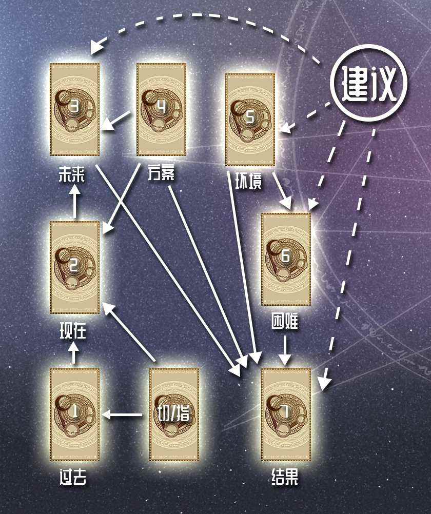 代表過去的第一張牌表示已經發生過的各種情況;第二張牌表示現在正存在的狀況;第三張牌表示未來將要出現的狀況;第四張牌是面對未來的情況可以選擇的行動方案;第五張牌是指本人無法控制的一些環境因素;第六張牌是指這件事情的發展中會遇到的困難;第七張牌表示最終可能出現的結果