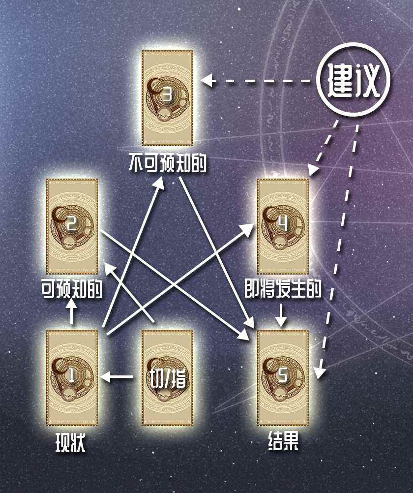 第一張牌表示目前的狀況;第二張牌表示的是環境變化中可以預知的情況;第三張牌表示環境變化中本人無法預知的情況;第四張牌表示的是事情即將有的發展;第五張牌表示如果延續第四張牌的發展趨勢,將會出現的結果