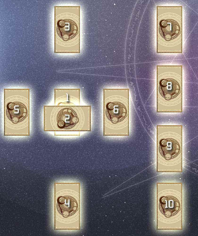 洗牌後,從上向下數: 第7張牌放在位置① 第8張牌放在位置② 第9張牌放在位置③ 第10張牌放在位置④ 第11張牌放在位置⑤ 第12張牌放在位置⑥ 第13張牌放在位置⑦ 第14張牌放在位置⑧ 第15張牌放在位置⑨ 第16張牌放在位置⑩ 牌所在位置表示的意義: